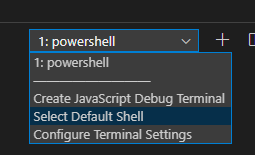 해결 방법은 간단하다, 터미털 탭 쪽에 '1. powershell'을 클릭한 뒤 'Select Default Shell'