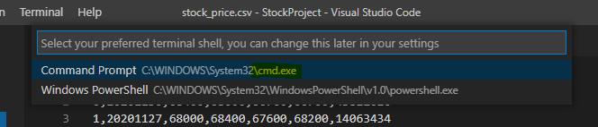 Command Prompt, cmd.exe를 선택한 뒤, 터미널을 재시작하면 된다.