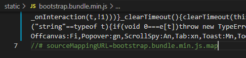 부득이하게 파일을 업로드할 수 없는 경우에는 bootstrap.bundle.min.js 파일을 연 뒤, 하단을 보면 아래처럼 나와있는데 이것을 조금 변경하여 sourceMapping을 띄어쓰기해서 'source Mapping'로 바꾸시어 무력화하면 됩니다.