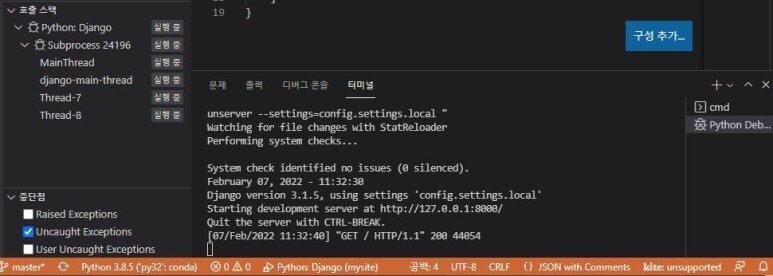 추가한 "--settings=config.settings.local"은 서버 가동 세팅을 config, settings 폴더 안에 있는 local.py 파일로 한다는 의미이다. (나눠놓지 않았다면 이미 위에서 성공적으로 가동했을 테니 수정할 필요가 없다.)