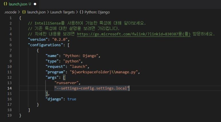 추가한 "--settings=config.settings.local"은 서버 가동 세팅을 config, settings 폴더 안에 있는 local.py 파일로 한다는 의미이다. (나눠놓지 않았다면 이미 위에서 성공적으로 가동했을 테니 수정할 필요가 없다.)