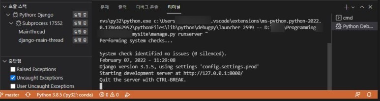 주르륵 뜨는 글씨 중에서, 위에서는 using settings 'config.settings.prod'로 나왔었지만 지금은 using settings 'config.settings.local'로 바뀐 것을 알 수 있다.
