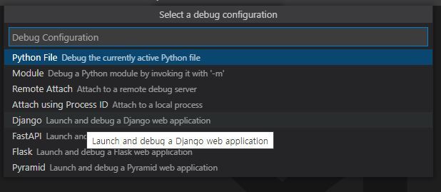 '실행 및 디버그' 버튼을 누르면 중앙에 환경 선택 목록이 나오는데, Django에 사용할 테니 Python을 선택해 준다.