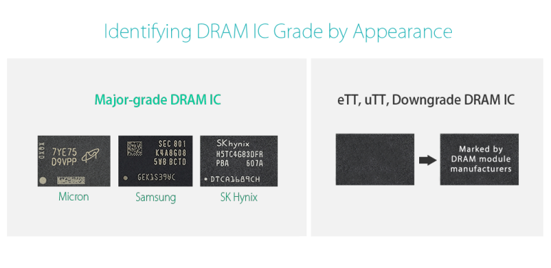 상업용 DRAM 모듈 제조업체는 대개 eTT, uTT를 사용하고 심지어 다운그레이드 IC를 사용하기도 합니다. 특히 가격을 따지는 소비재나 저가 애플리케이션에 이러한 종류의 IC를 많이 사용합니다. eTT, uTT, 다운그레이드 IC는 모두 DRAM 모듈 제조업체의 상표와 함께 인쇄되기 때문에 겉보기에 비슷하여 혼동을 일으키기 쉽습니다. 그래서 고객과 구매자가 이 세 가지 종류의 IC를 구분하고 DRAM IC의 품질을 식별하기가 더욱 어렵습니다.