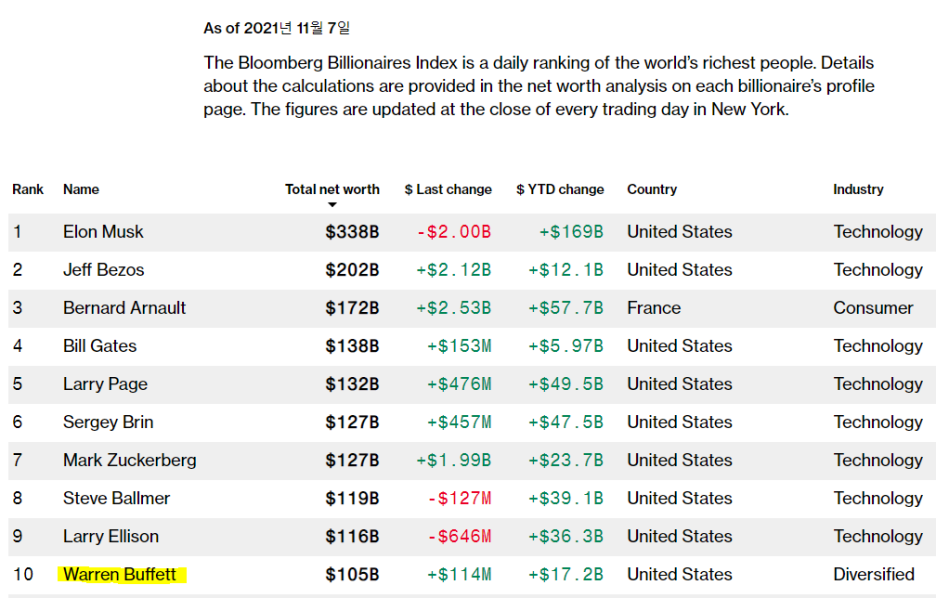 전세계에서 가장 부유한 사람들의 목록이며 코로나 팬데믹과 최근 기술, 테크주들의 주가 상승으로 순위가 몇개단 내려오긴 했으나 그럼에도 불구하고 10위에 기록하고 있고 '가치투자'의 대명사가 된 워런 버핏의 인터뷰 내용이다.
