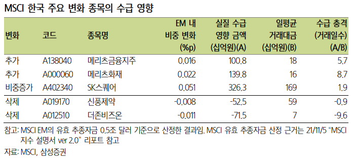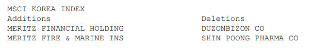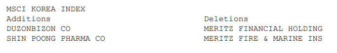 MSCI Global Standard Indexes 중 한국 지수(MSCI KOREA INDEX)에서는 2종목 추가, 2종목 제외되었는데, MSCI Global Small Cap Indexes에 있던 메리츠가 상위 지수로 올라갔고, 더존비즈온과 신풍제약은 하위 지수로 강등되었다.