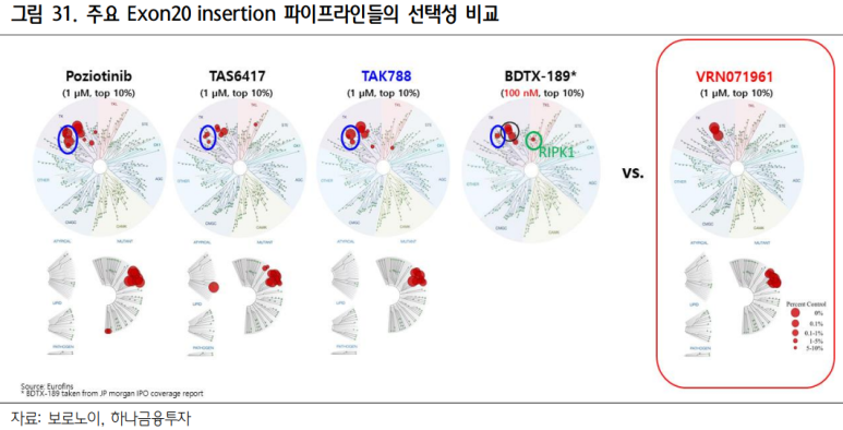 EGFR Exon20 INS 타겟 시장은 경쟁자로 다케다(Takeda)의 EXKIVITY 약물이 존재하며(블루프린트 Blueprint Medicines를 전임상 단계에서 기업 인수 5,300억 원 규모) 시장 규모는 3조 원 이상으로 추정됩니다. 보로노이의 후보물질 VRN07은 성공률 33% 감안시 3,500억 원이 예상되며, 중국시장의 가치까지 포함한다면 5,700억 원으로 추정됩니다.