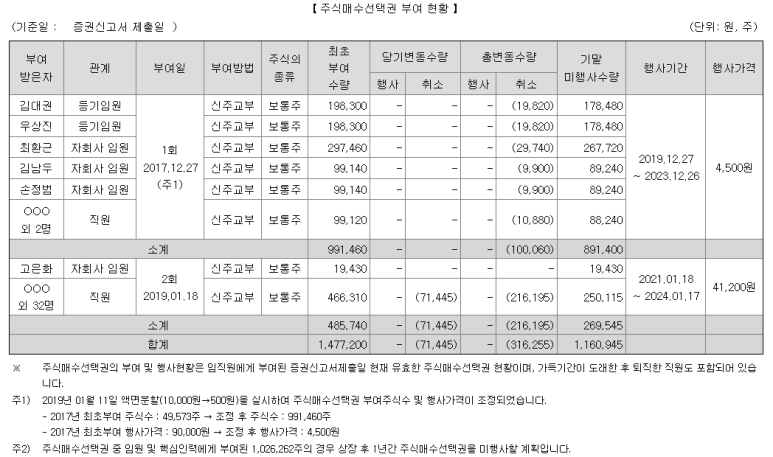 주식매수선택권(Stock-option) 및 전환사채로 인한 상장주식수 증가로 지분희석 위험이 있습니다. 현재 미행사 주식매수선택권은 1,160,945주, 전환사재 권리 행사는 500,000주입니다. 총 1,660,945주로 예상 상장주식수는 14,994,894주입니다. 전체 주식수의 11.07%를 차지하는 꽤 큰 비중으로 유의해야 합니다.