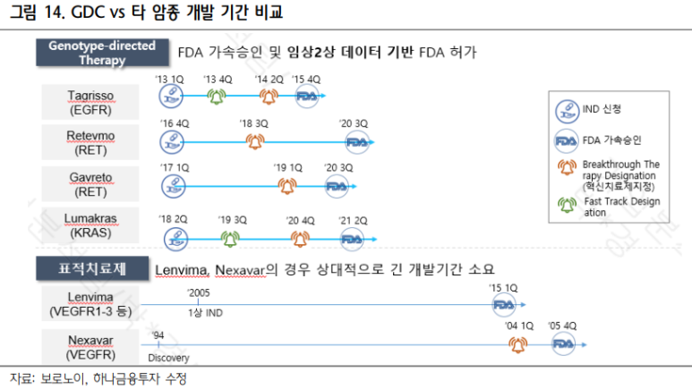 이러한 점에서 GDC 파이프라인은 개발 성공 확률이 높다. 암의 원인이 유전적으로 명확하게 규명되어 있어 표적의 검증에서 상대적으로 자유롭고, 유효성을 확인하기 위한 동물 모델이 잘 갖춰줘 있다. 또한 항암제이기 때문에 Risk-Benefit 측면에서 장기 복용/투여가 필요한 만성 질환 대비 장기 안전성(발암 독성, 유전 독성 등)에 대한 규제기관의 기준이 낮으며 정상 단백질을 타겟하는 의약품과 달리 표적 외 독성(On target toxicity)이 발생할 우려가 적다.