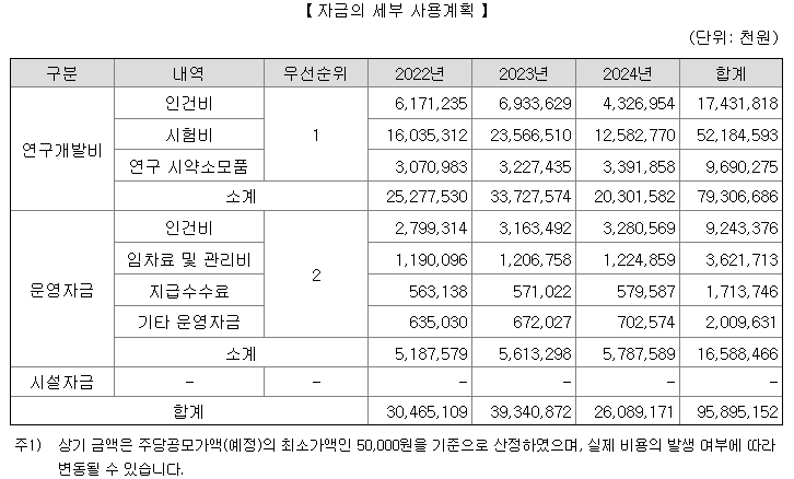 먼저 공모가액이 50,000원으로 결정되었을 경우 958.95억 원의 순수입금이 생기는데, 확보된 자금으로 연구개발비로 793억원, 운영자금으로 166억원을 사용할 계획입니다.