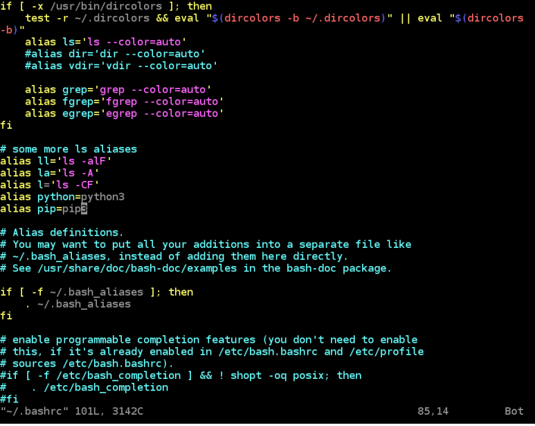 vi ~/.bashrc 을 입력하게 되면 vi 편집기를 통해 파일을 확인, 수정하는 화면으로 바뀝니다.