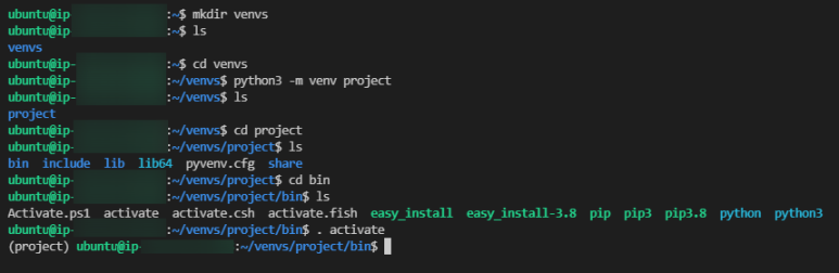 새로 생긴 폴더 'bin'에 들어가서 '. activate'를 입력하면 파이썬 가상환경이 실행됩니다.