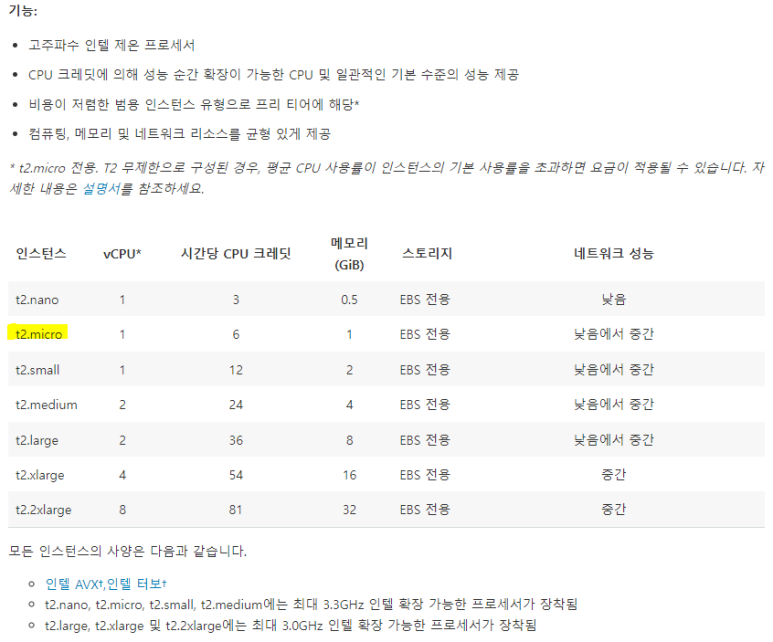 EC2 프리 티어 t2.micro 성능, 명칭 설명