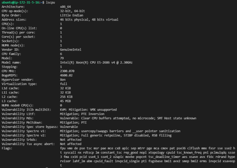 서버에 사용된 CPU를 'lscpu' 명령어를 통해 확인해보면, 'Intel Xeon CPU E5-2686 v4'가 사용되고 있는 것을 확인할 수 있습니다.