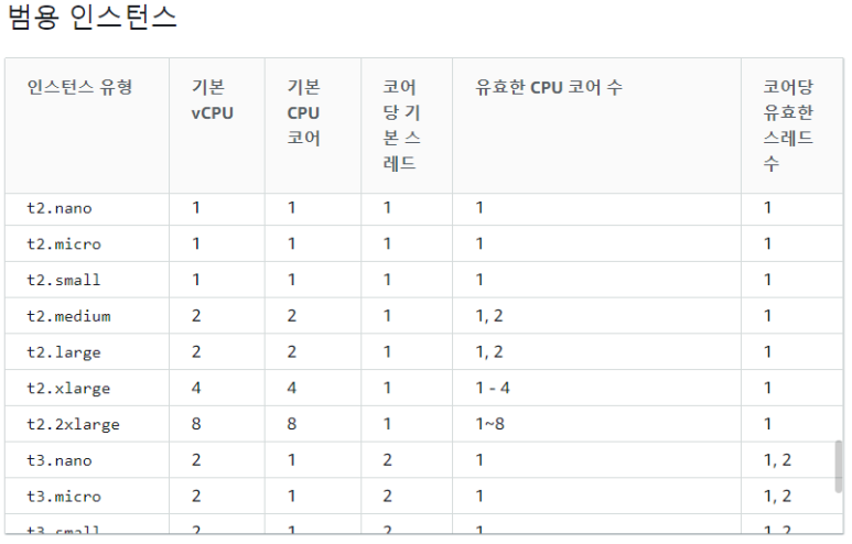 위에서 얘기했던 내용으로, AWS에서는 1 CORE = 2 vCPU(1:2)로 사용하고 있습니다.