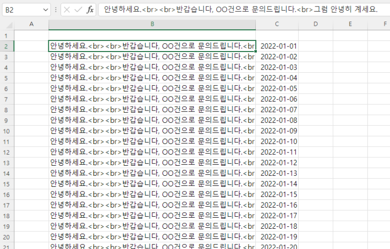 DB에 저장된 게시글을 엑셀로 불러온다거나, 어떤 이유로든 엑셀에서 '줄 바꿈'을 한번에 처리해야 할때 쉽게 처리할 수 있는 방법입니다. (Enter, 엔터를 누른 것 같은 기능입니다.)