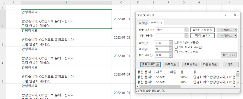 이 상태로 모두 찾기 → 모두 바꾸기를 진행해도 되지만, 보기 좋게 줄 바꿈이 되어 있는 모습을 보고 싶다면 서식(M)에서 맞춤 탭 → 텍스트 조정에 '자동 줄 바꿈(W)'을 클릭 후 확인을 눌러 적용한 뒤 진행하면 됩니다.