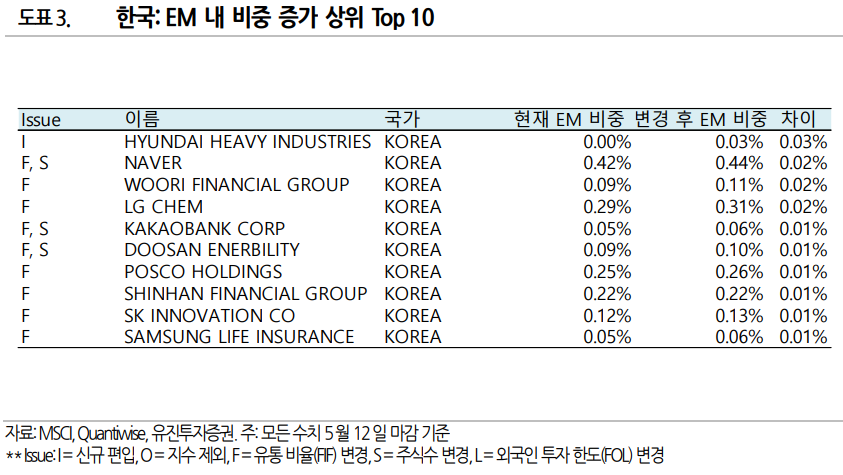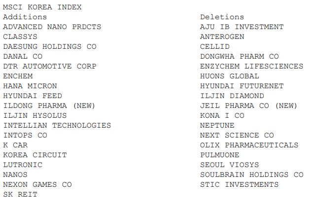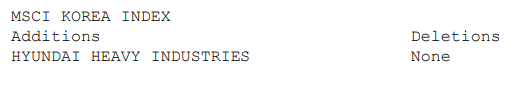 MSCI 5월 반기 리뷰(Semi-annual Index Review)가 발표되었다. MSCI GLOBAL STANDARD INDEXES 중 한국 지수(MSCI KOREA INDEX)에서는 종목 1개가 신규 추가되었다.