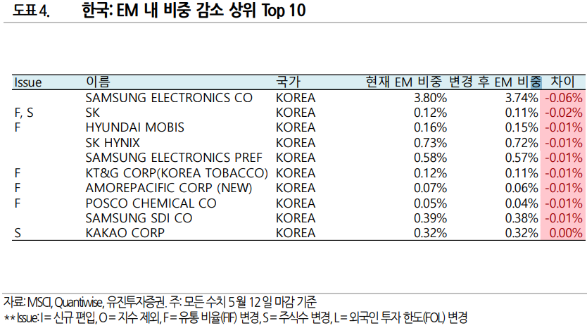 그 외에 리밸런싱으로 인한 종목별 비중이 변경되었고, 결과적으로 한국 비중이 12.7%에서 12.6%로 감소되었다. (중국, 사우디 등은 비중 증가하였음.)