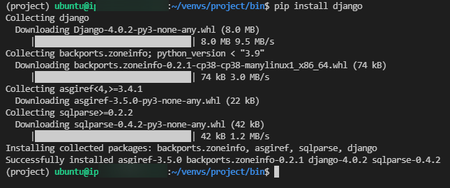 이전 포스팅에서 만든 가상환경을 실행한 뒤 진행한다. 사진에 보면 괄호로 '(project)' 표시된 것이 있어야 한다.