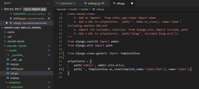 지금은 간단하게 '웹사이트(프로젝트) - urls.py - index.html' 이 구성으로 만들 것이다.