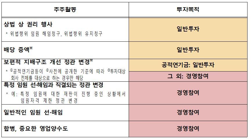 일반투자 목적은 임원 보수, 배당 관련 주주 제안 등 경영권 영향 목적은 없으나 적극적인 유형의 주주 활동을 하는 경우를 말한다. 배당 증액이나 보편적 지배구조 개선 정관변경 등을 요구하며 주주 행동을 나서는 것이다. (정관 변경은 사전에 공개한 기준에 따라 투자대상 회사 전체를 대상으로 한 경우에만 가능하다.)