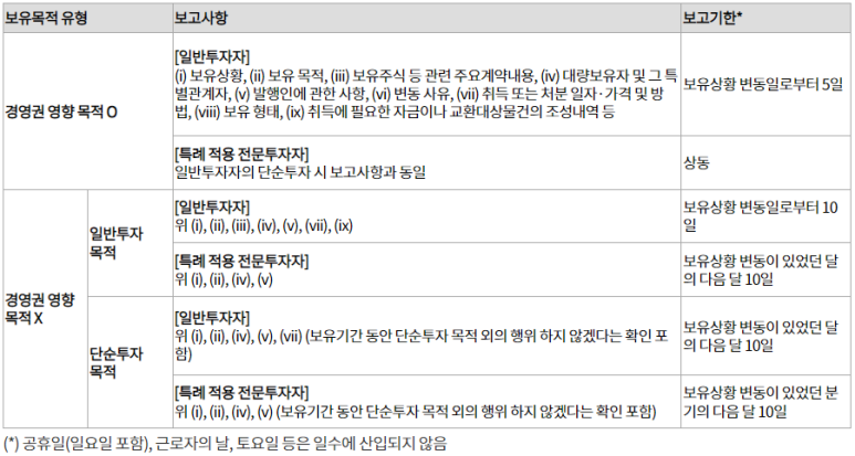 그리고 보고기한 차이가 있다. 단순투자 목적은 보유상황 변동이 있었던 분기의 다음 달 10일 안에 보고를 하면 되지만 일반투자 목적은 10영업일 안에 보고를 해야 한다. 보고기한이 강화된다고 볼 수 있다.