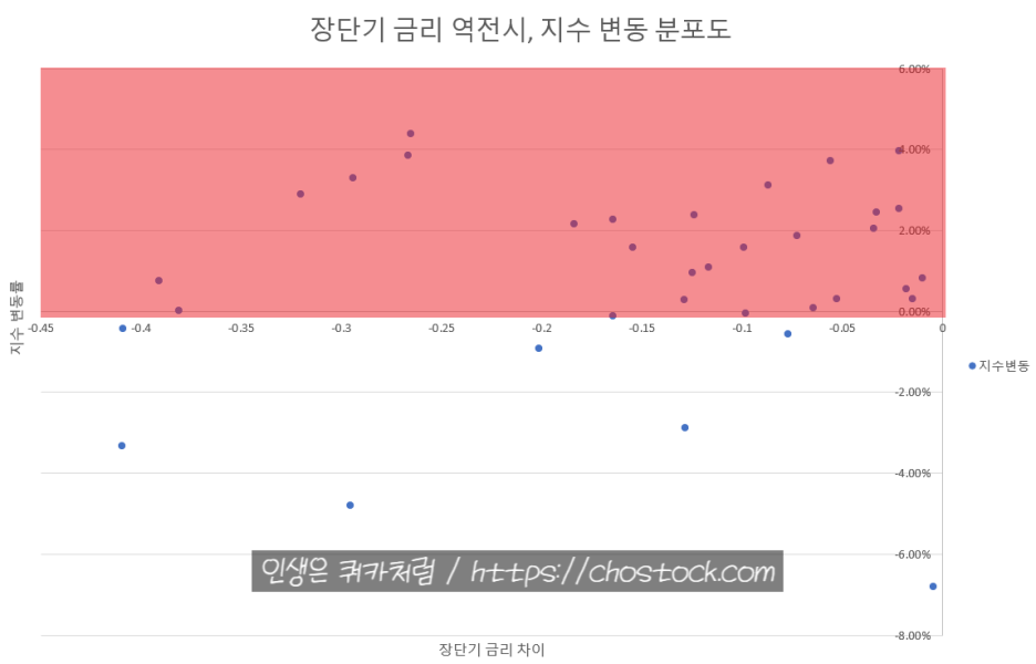 차트상으로도 대강 확인해 볼 수 있으나 분포도를 통해 보다 명확하게 확인해 보겠다. 금리 역전이 발생한 달에 증시의 변동률을 같이 표시해 보았다.