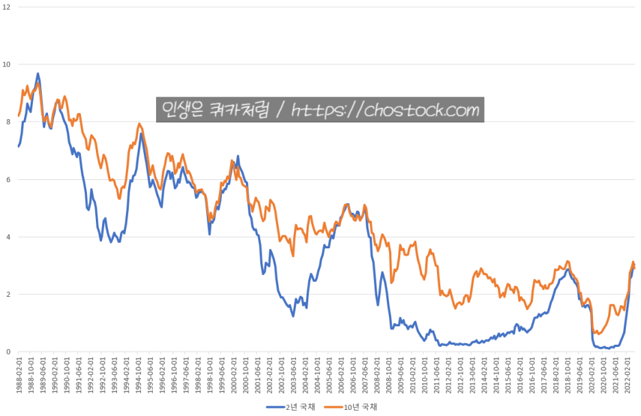 이 중 장기, 단기 금리는 10년물과 2년물을 의미한다. 2년물 국채 수익률은 통화정책 변화를 잘 반영하며, 10년물 국채 수익률은 현재 경제 상황에 따라 움직인다.