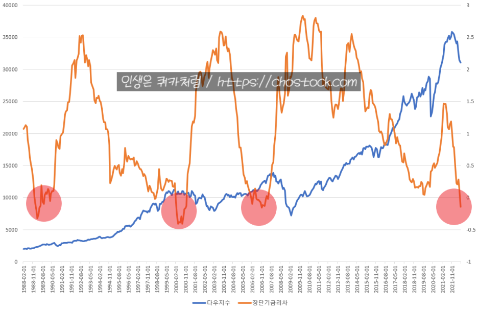1988년부터 2022년 현재까지의 다우지수와 2년물 국채 금리와 10년물 국채 금리의 스프레드를 표시한 자료이다. 수치가 0 이하로 떨어진 부분이 금리 역전이 발생한 것이다. (데이터를 월 평균으로 수치를 냈기 때문에 일 데이터로 본 것과 차이가 있을 수 있다.)