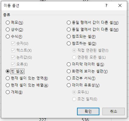 여러 종류들이 나오는데, 빈 셀(K) 체크한 후 확인을 클릭한다.