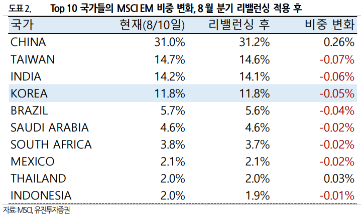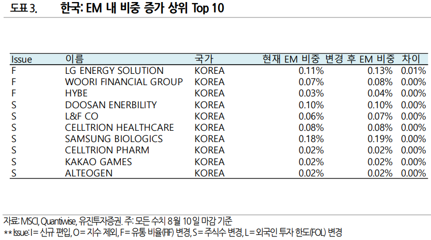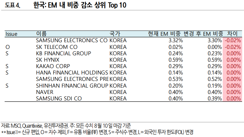 이에 따라 KOREA INDEX 구성 종목 수는 기존 112개에서 111개로 변경, 8월 31일이 리밸런싱일, 9월 1일이 변경 유효일(Effective date)이다.