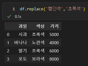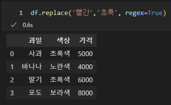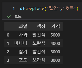'빨간'을 '초록'으로 치환하려고 입력했으나 변경되지 않았다. replace는 문자열이 완전히 일치하는 것만 변경할 수 있다.