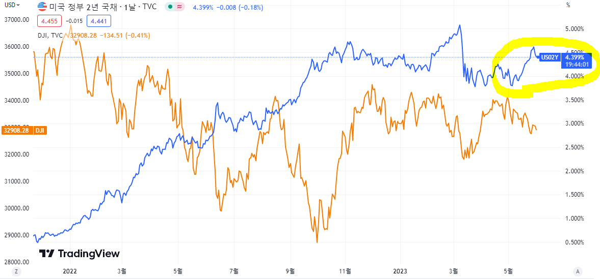 왜 이런 일이 발생했는지는 의아하나... 최근 미국 2년물 국채 수익률이 상승하는 이유는 신용평가 강등 우려 때문이 아닌, Fed의 금리 인상 우려 때문이라는 것을 알 수 있었다.