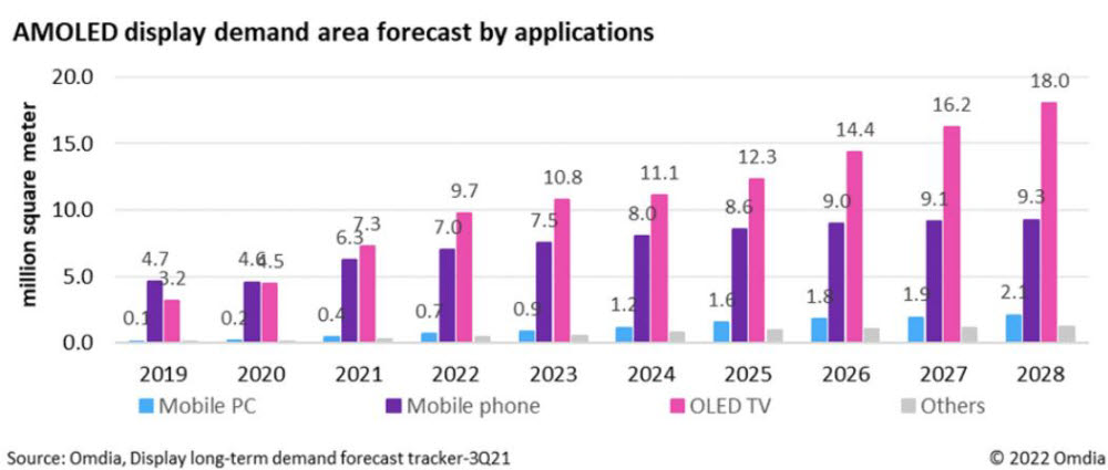 올해 2022년 OLED 패널 크기 기준으로 OLED TV가 7.3M², Mobile phone이 6.3M², Mobile PC 0.4M²이다. OLED TV가 가장 큰 비중을 차지하는 것을 알 수 있다.