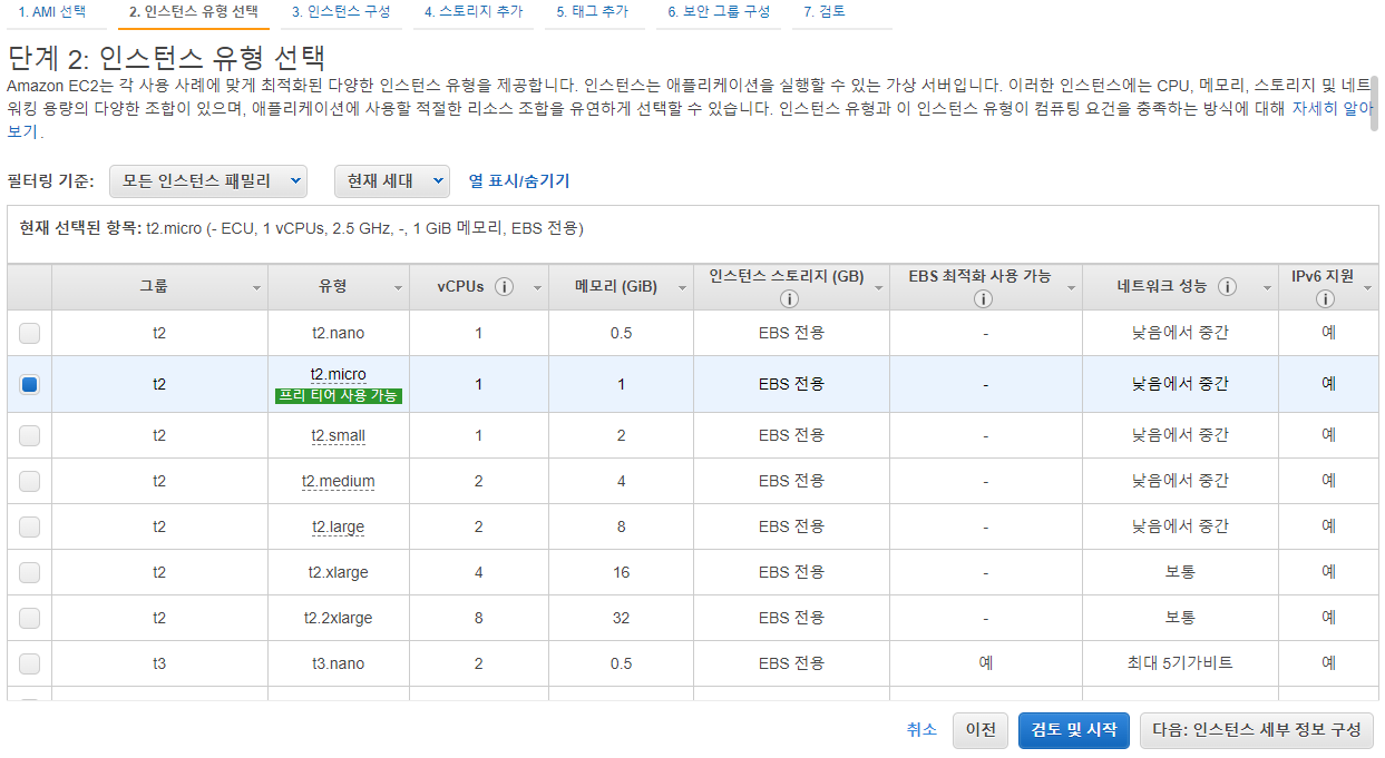 위에서 운영체제 선택을 하면 '2. 인스턴스 유형 선택'이 나오는데, 요금이 결정되는 가장 중요한(?) 곳이다.