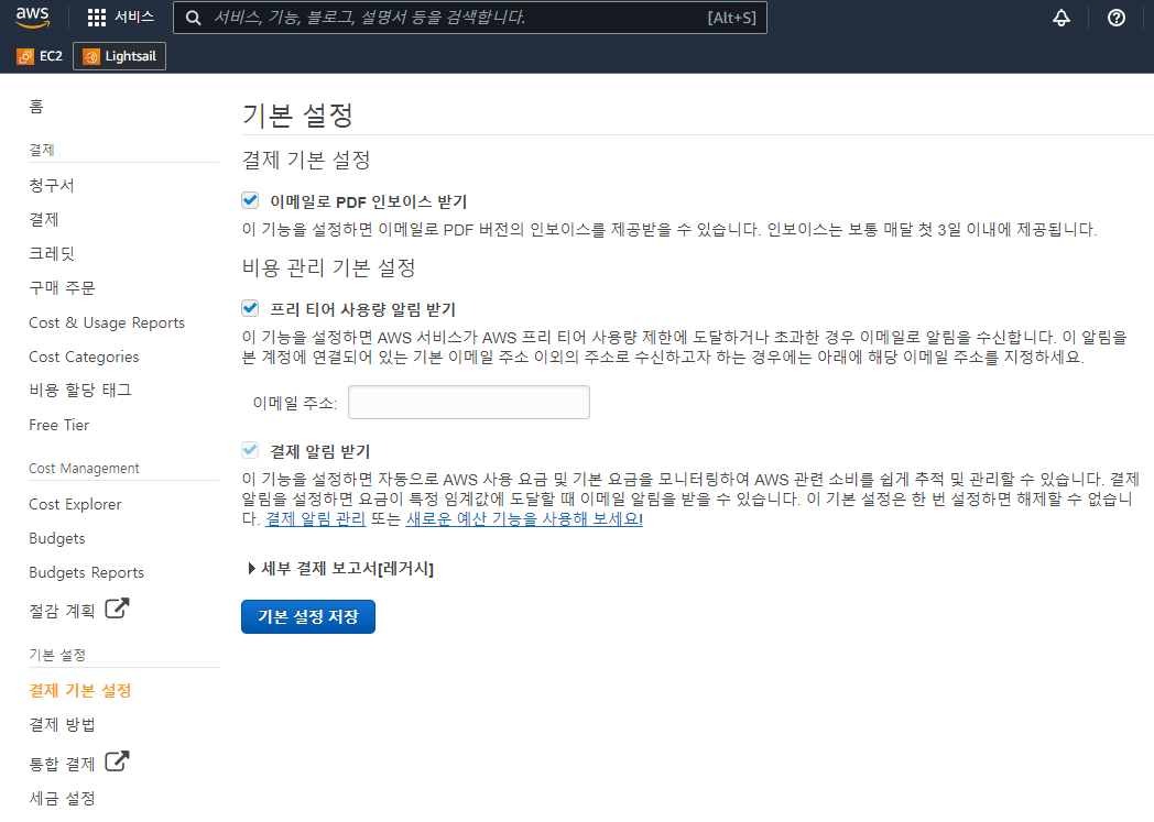 프리 티어가 무료로 사용할 수 있긴 하지만 과도하게 많은 사용을 한다거나, 무료 기간이 끝나면 요금이 나오기 시작한다. 미리 알림을 받기 위해 오른쪽 상단의 계정 이름이 적힌 곳을 클릭 후 '계정' → '결제 기본 설정'에 들어가 체크를 해준다.