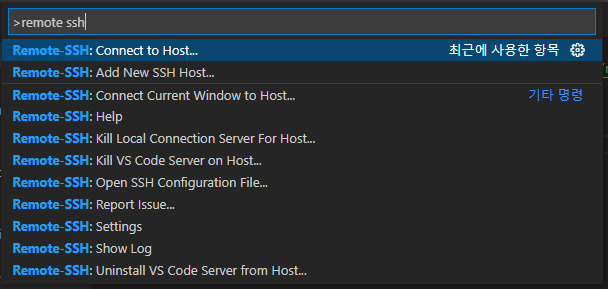 설치가 다 끝났다면 'Ctrl+Shift+P'를 동시에 눌러 중앙 상단에 입력하는 칸을 띄운다. 그 후 'Remote SSH'을 입력하면 'Remote-SSH: Connect to Host...'가 나온다, 클릭하자.