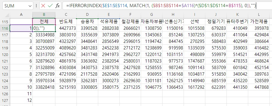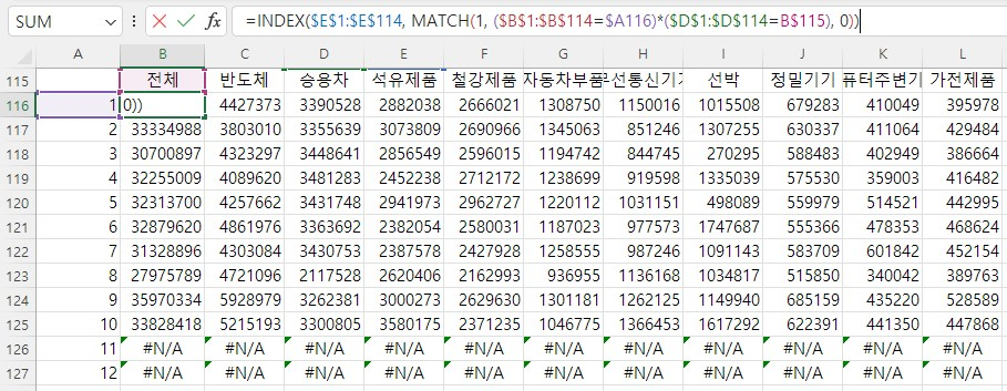 MATCH(1, ($B$1:$B$114=$A116)*($D$1:$D$114=B$115), 0) : 조건을 만족하는 첫 번째 행의 위치를 찾으면서, '월'이 1이고, '품목'이 전체인 조건을 만족하는 행을 찾는다.