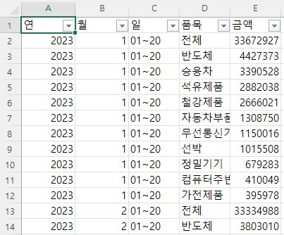 관세청의 수출입무역통계 사이트에서 수출입 데이터를 다운로드하였으나, 사이트 개편으로 변경되어 10일 단위 잠정치 통계가 과거처럼 정리가 되어 있지 않아 보기 어려웠다.