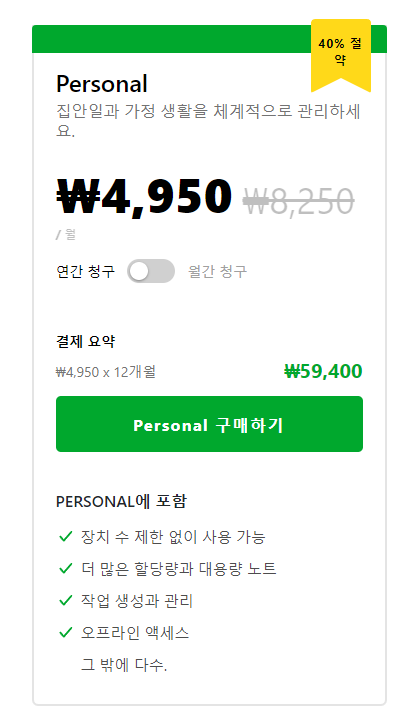 그랬더니 기존 사용하던 'Personal'은 현재 정가가 연간 99,000원인 상품이지만, 에버노트 측에서 구독 해지를 방어하기 위해 무려 40% 할인한 가격인 연간 59,400원(월 4,950원)에 해주겠다며 꼬드겼다. (이 방법은 에버노트를 사용하는 사람들을 위한 꿀팁이기도 하다.)