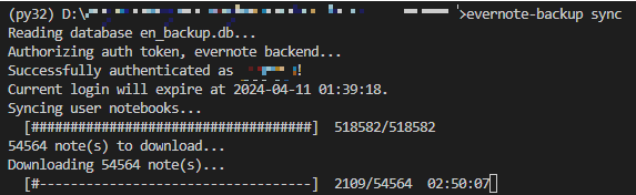 3. 'evernote-backup sync' 입력해 에버노트의 모든 노트들을 서버에서 백업(다운로드)한다.