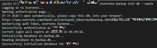 2. 설치가 완료되면 'evernote-backup init-db' 입력한다. Gmail이나 Apple 계정으로 로그인하는 경우 --oauth 추가하여 'evernote-backup init-db --oauth'을 입력한다.