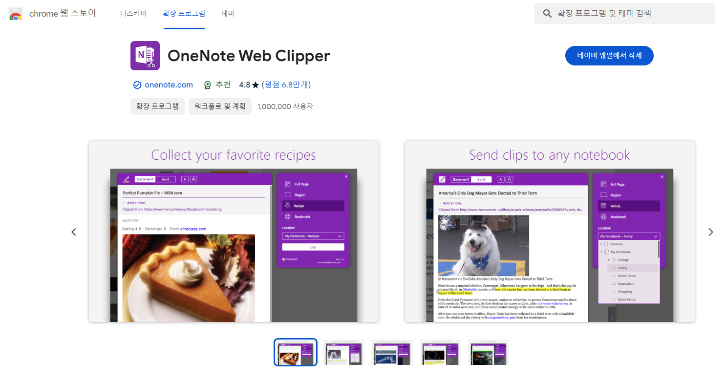 그러다가 Microsoft의 OneNote를 보았더니 내가 많이 사용하는 뉴스 스크랩을 위한 확장 프로그램(OneNote Web Clipper)도 있고, 무엇보다 '무료로 무제한 업로드'가 가능하다는 점이 마음에 들었다. UI와 동기화 부분은 에버노트가 좀 더 보기 좋고 익숙해졌지만 크게 지장이 있는 것은 아니었다.