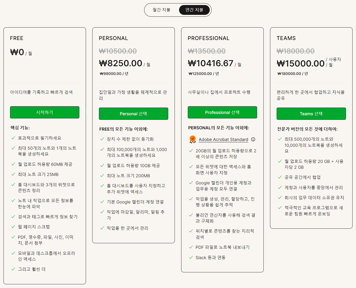 그랬더니 기존 사용하던 'Personal'은 현재 정가가 연간 99,000원인 상품이지만, 에버노트 측에서 구독 해지를 방어하기 위해 무려 40% 할인한 가격인 연간 59,400원(월 4,950원)에 해주겠다며 꼬드겼다. (이 방법은 에버노트를 사용하는 사람들을 위한 꿀팁이기도 하다.)