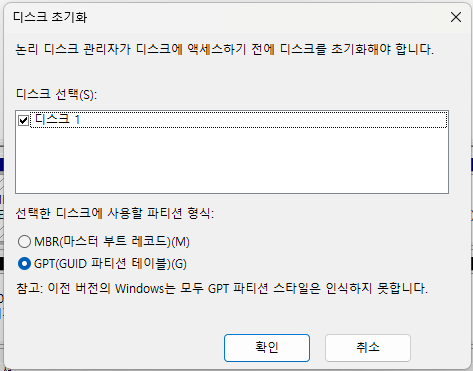 그럼 아래처럼 '디스크 초기화' 창이 뜨는데, 확인을 눌러준다.
