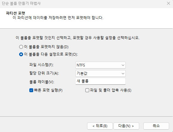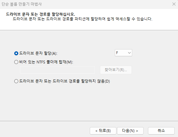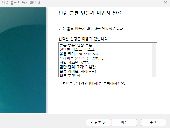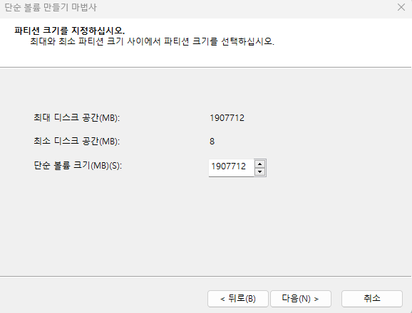 파티션을 2개로 나누고 싶다면, 2번째 단계에서 용량을 조절 후 진행한 후 다시 과정을 반복해 주면 된다.