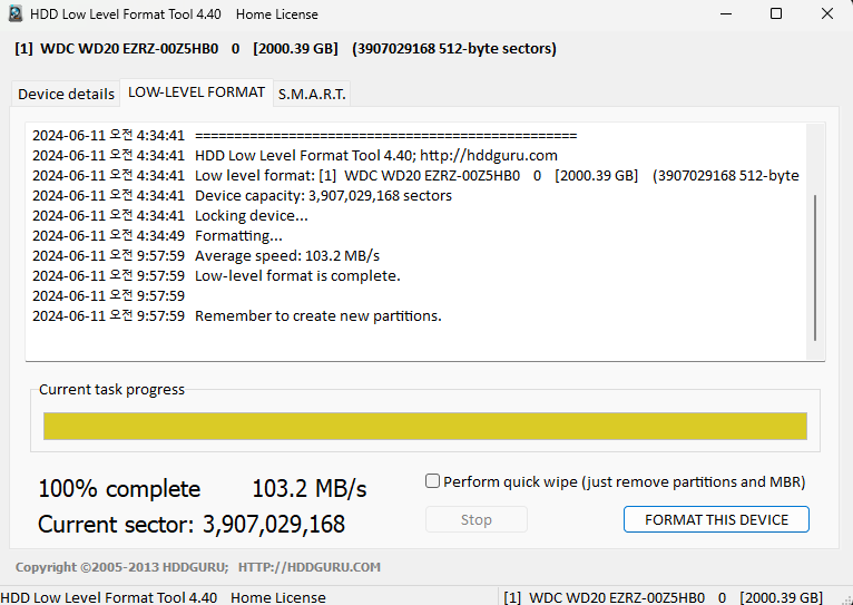 상단 탭에서 'LOW-LEVEL FORMAT'을 선택 후 'FORMAT THIS DEVICE'을 클릭하면 괘 오랜 시간에 걸쳐 진행하게 된다.