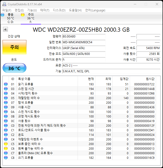 웨스턴디지털에서 제조한 WD20EZRZ(Western Digital WD BLUE 2TB, 5400/64M)는 내가 6년 전 구매하여 현재까지 쓰고 있는 하드디스크이다. 이전에도 '보류 중인 섹터 수'에 표시되었어서 로우 포맷을 진행했음에도 불구하고 배드섹터가 또다시 생겼다.
