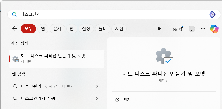 혹은 시작 메뉴의 돋보기(검색)에 '디스크 관리'를 검색해서 들어가도 된다.